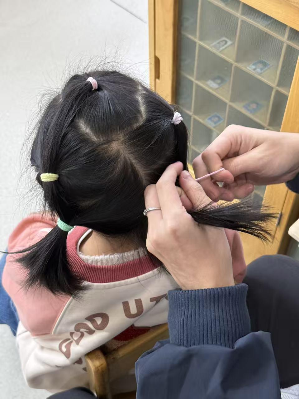 掌握方法后的叶老师仿佛“开了挂”,没多久就俘获了孩子们的心。如今,他又多了一项扎头发的技能,更是引来了别的班小朋友的羡慕。